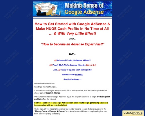 Description: How to get started with Google Adsense & make huge cash profits in no time at all & with very little effort. Get 355 FREE Adsense Websites and 43 Adsense E-books, Softwares and Videos Valued at Over $1,900.00